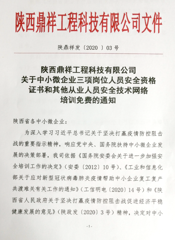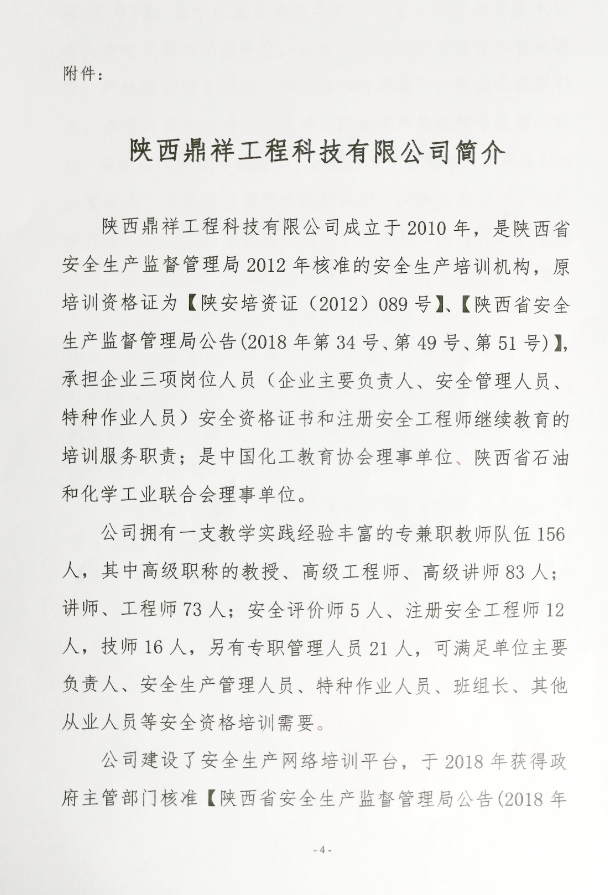 陜西鼎祥始終致力于“以安全科學技術為核心,國家安全生產(chǎn)法律法規(guī)為準則,企業(yè)安全文化為靈魂,創(chuàng)新安全培訓,提升安全技能,為生命安康護航”。通過與政府主管部門、企業(yè)之間的協(xié)同效應,提升安全培訓效果!促進企業(yè)安全文化建設不斷發(fā)展!我們將孜孜追求、不懈努力,提升從業(yè)人員安全意識與安全技能,為客戶創(chuàng)造更為安全的生產(chǎn)條件。