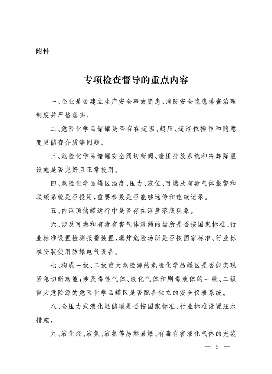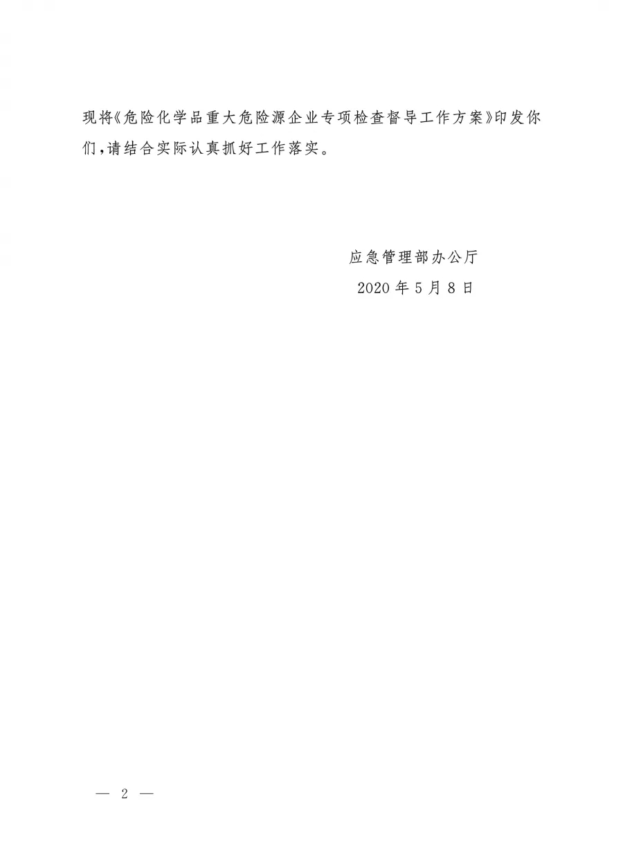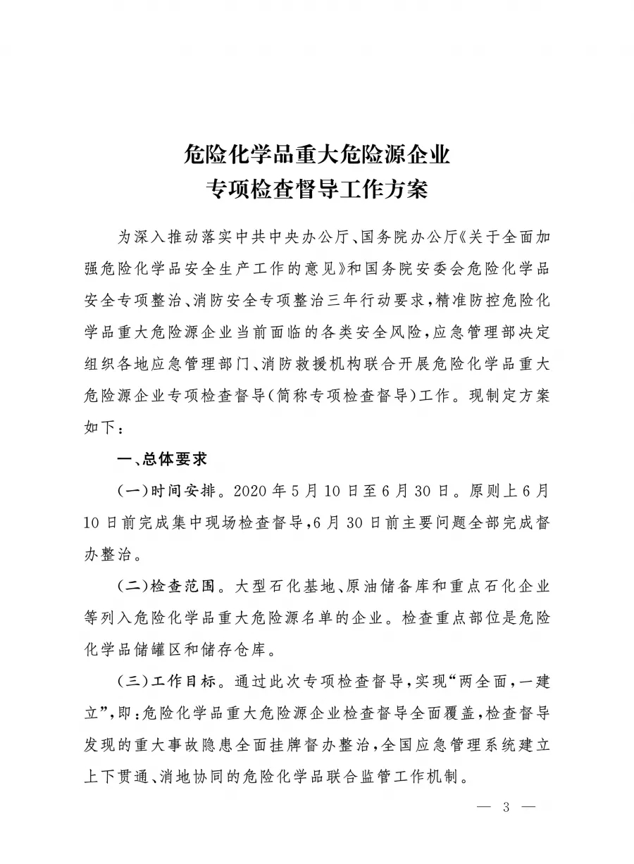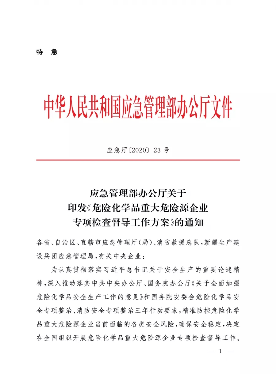 應(yīng)急廳〔2020〕23號(hào) 危險(xiǎn)化學(xué)品重大危險(xiǎn)源企業(yè)專(zhuān)項(xiàng)檢查督導(dǎo)工作方案 |