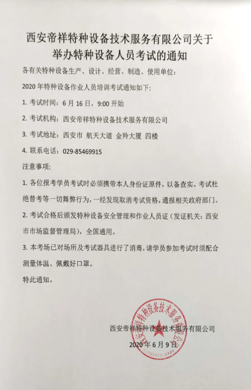 西安帝祥特種設(shè)備技術(shù)服務(wù)有限公司根據(jù)通知精神,為給考生提供安全、清潔的考場環(huán)境,本考點(diǎn)做了大量準(zhǔn)備工作,對(duì)考場進(jìn)行全面消殺,做好室內(nèi)通風(fēng),保證考場符合良好的衛(wèi)生要求。決定于2020年6月16日舉辦特種設(shè)備人員考試工作。